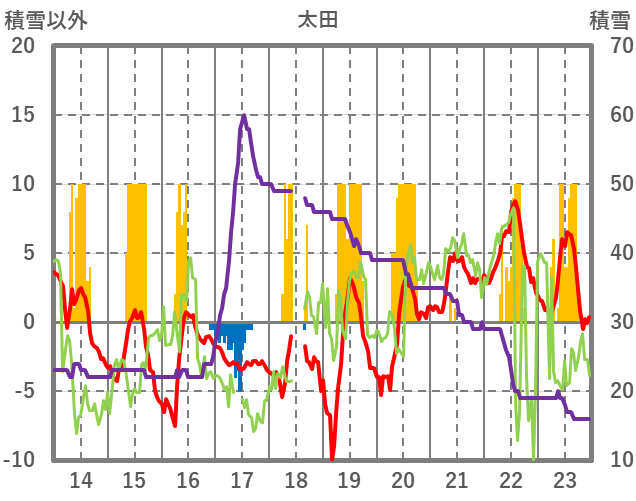 | 日 | 時 | 気温 | 降水 | 風向/風速 | 日照 | 積雪 | 降雪 |