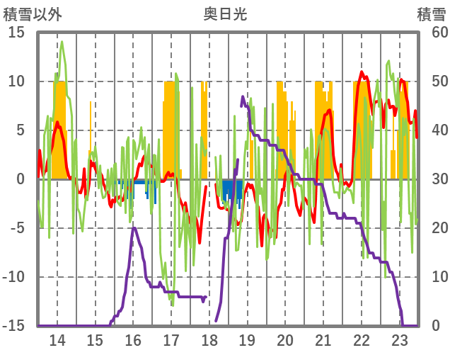 | 日 | 時 | 気温 | 降水 | 風向/風速 | 日照 | 積雪 | 降雪 |