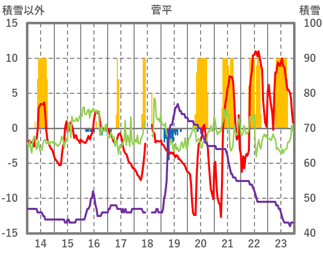 | 日 | 時 | 気温 | 降水 | 風向/風速 | 日照 | 積雪 | 降雪 |