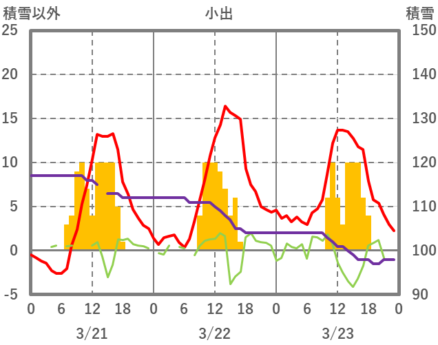 | 日 | 時 | 気温 | 降水 | 風向/風速 | 日照 | 積雪 | 降雪 |