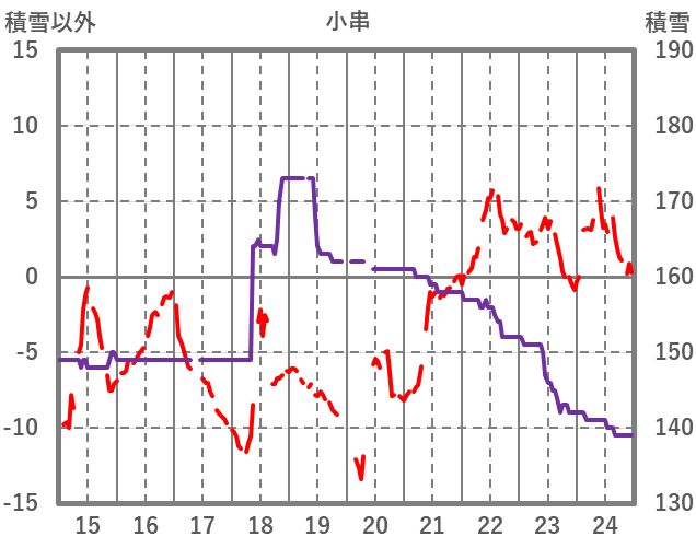 | 日 | 時 | 気温 | 降水 | 風向/風速 | 日照 | 積雪 | 降雪 |