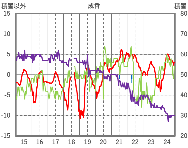 | 日 | 時 | 気温 | 降水 | 風向/風速 | 日照 | 積雪 | 降雪 |