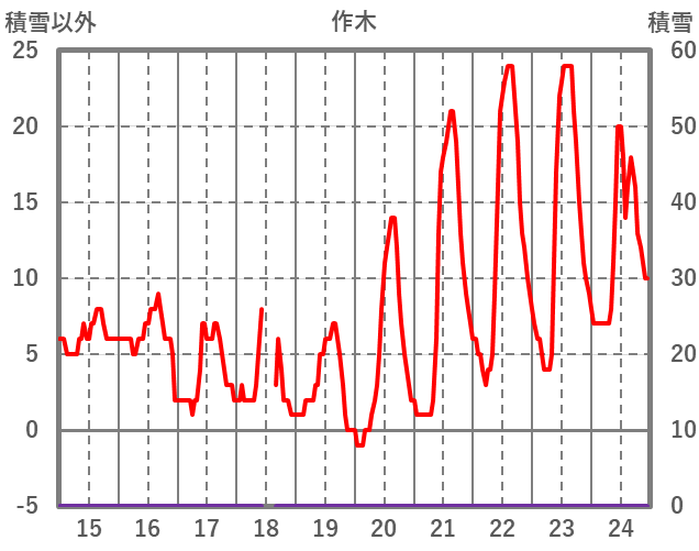 | 日 | 時 | 気温 | 降水 | 風向/風速 | 日照 | 積雪 | 降雪 |