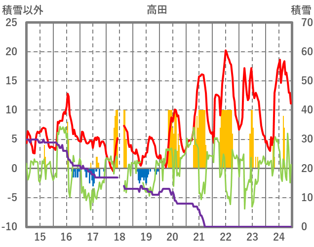 | 日 | 時 | 気温 | 降水 | 風向/風速 | 日照 | 積雪 | 降雪 |