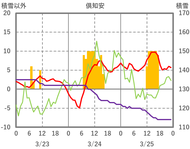| 日 | 時 | 気温 | 降水 | 風向/風速 | 日照 | 積雪 | 降雪 |