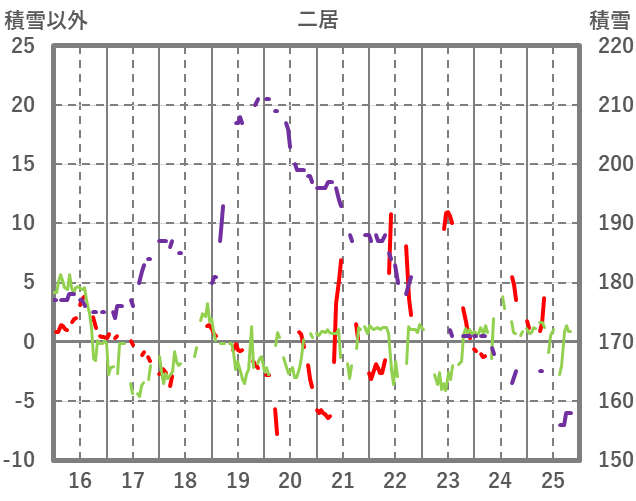 | 日 | 時 | 気温 | 降水 | 風向/風速 | 日照 | 積雪 | 降雪 |