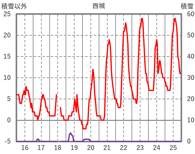 | 日 | 時 | 気温 | 降水 | 風向/風速 | 日照 | 積雪 | 降雪 |