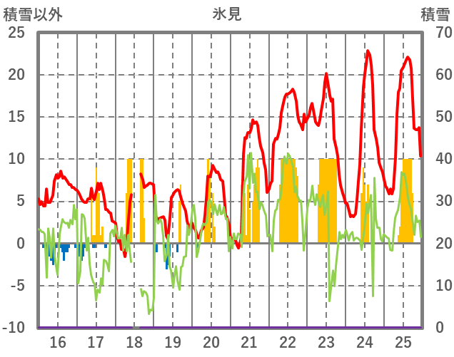| 日 | 時 | 気温 | 降水 | 風向/風速 | 日照 | 積雪 | 降雪 |