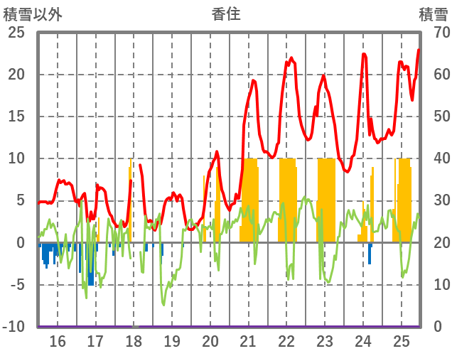 | 日 | 時 | 気温 | 降水 | 風向/風速 | 日照 | 積雪 | 降雪 |