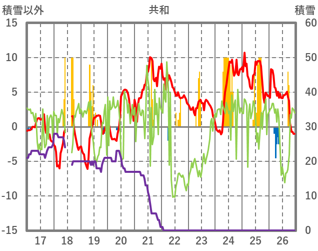 | 日 | 時 | 気温 | 降水 | 風向/風速 | 日照 | 積雪 | 降雪 |