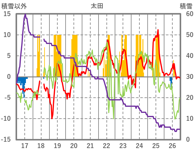 | 日 | 時 | 気温 | 降水 | 風向/風速 | 日照 | 積雪 | 降雪 |