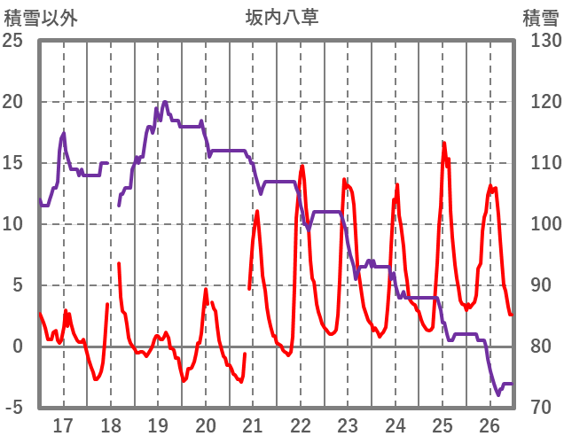 | 日 | 時 | 気温 | 降水 | 風向/風速 | 日照 | 積雪 | 降雪 |