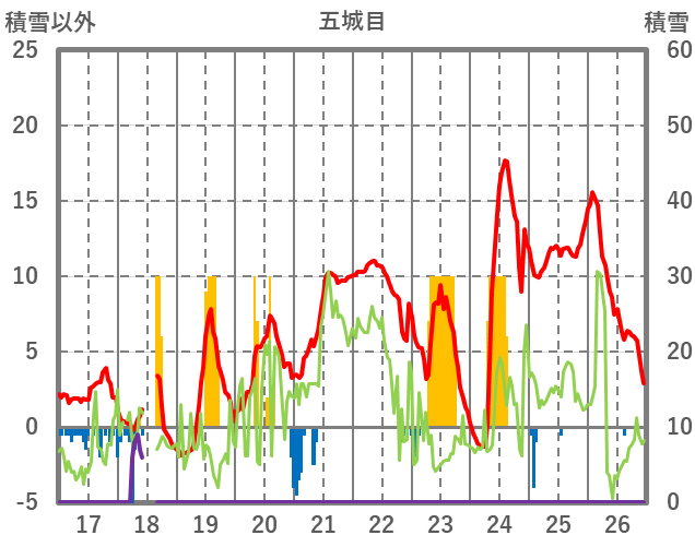| 日 | 時 | 気温 | 降水 | 風向/風速 | 日照 | 積雪 | 降雪 |