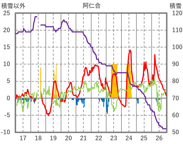 | 日 | 時 | 気温 | 降水 | 風向/風速 | 日照 | 積雪 | 降雪 |