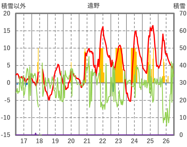 | 日 | 時 | 気温 | 降水 | 風向/風速 | 日照 | 積雪 | 降雪 |