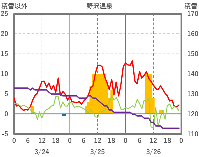 | 日 | 時 | 気温 | 降水 | 風向/風速 | 日照 | 積雪 | 降雪 |