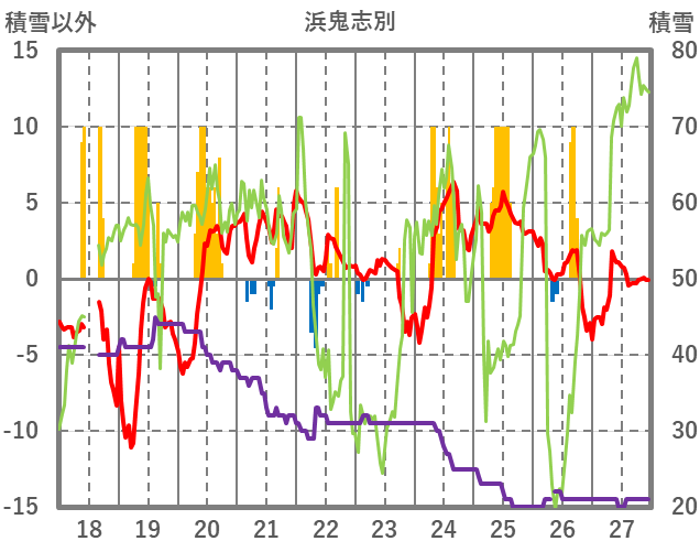 | 日 | 時 | 気温 | 降水 | 風向/風速 | 日照 | 積雪 | 降雪 |
