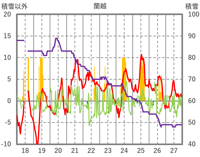 | 日 | 時 | 気温 | 降水 | 風向/風速 | 日照 | 積雪 | 降雪 |