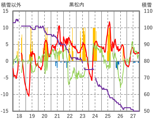 | 日 | 時 | 気温 | 降水 | 風向/風速 | 日照 | 積雪 | 降雪 |