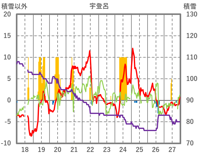 | 日 | 時 | 気温 | 降水 | 風向/風速 | 日照 | 積雪 | 降雪 |