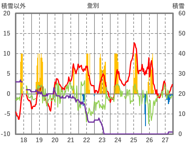 | 日 | 時 | 気温 | 降水 | 風向/風速 | 日照 | 積雪 | 降雪 |
