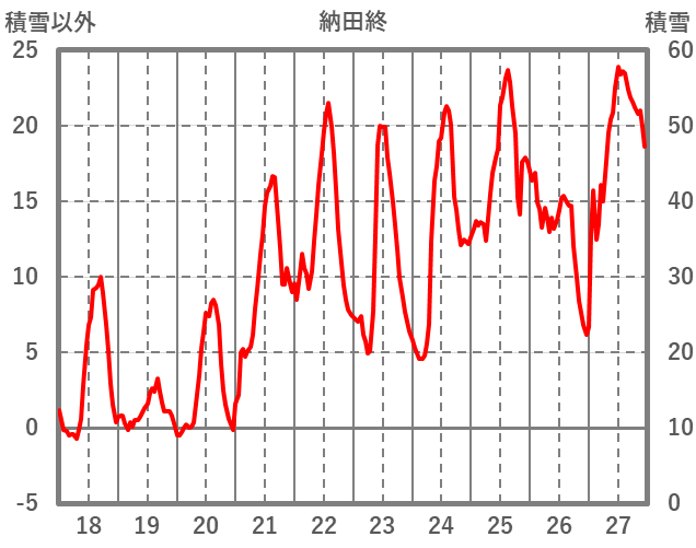 | 日 | 時 | 気温 | 降水 | 風向/風速 | 日照 | 積雪 | 降雪 |
