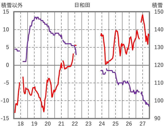 | 日 | 時 | 気温 | 降水 | 風向/風速 | 日照 | 積雪 | 降雪 |