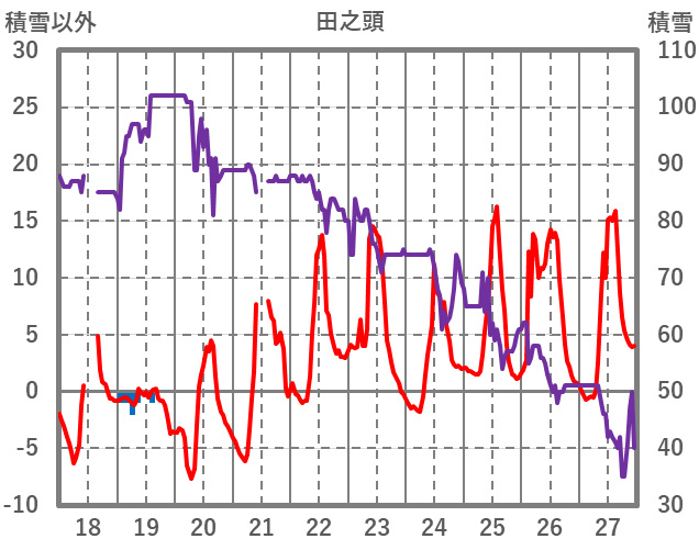 | 日 | 時 | 気温 | 降水 | 風向/風速 | 日照 | 積雪 | 降雪 |