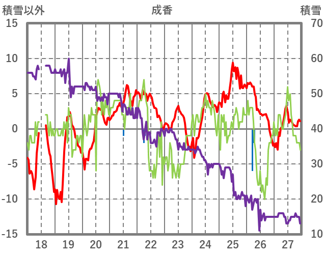| 日 | 時 | 気温 | 降水 | 風向/風速 | 日照 | 積雪 | 降雪 |