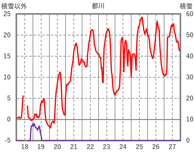 | 日 | 時 | 気温 | 降水 | 風向/風速 | 日照 | 積雪 | 降雪 |