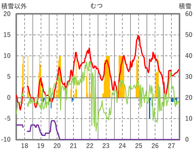 | 日 | 時 | 気温 | 降水 | 風向/風速 | 日照 | 積雪 | 降雪 |