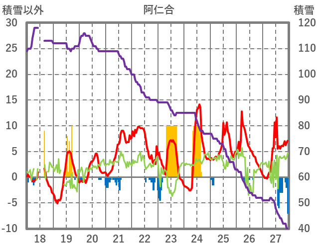| 日 | 時 | 気温 | 降水 | 風向/風速 | 日照 | 積雪 | 降雪 |