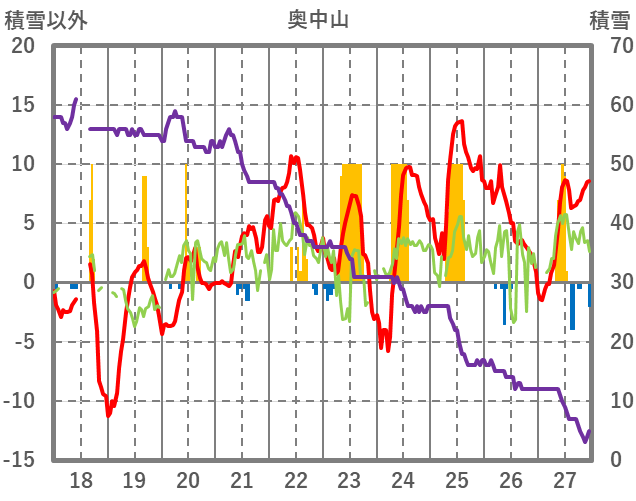 | 日 | 時 | 気温 | 降水 | 風向/風速 | 日照 | 積雪 | 降雪 |