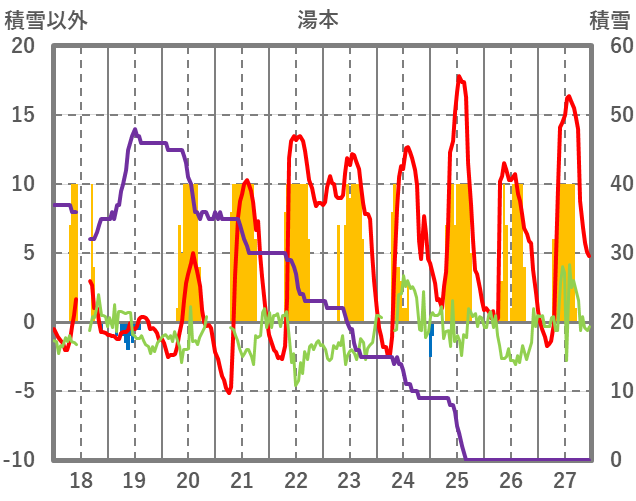 | 日 | 時 | 気温 | 降水 | 風向/風速 | 日照 | 積雪 | 降雪 |