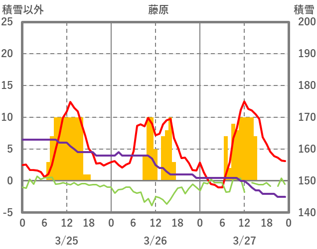 | 日 | 時 | 気温 | 降水 | 風向/風速 | 日照 | 積雪 | 降雪 |