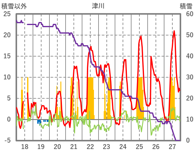 | 日 | 時 | 気温 | 降水 | 風向/風速 | 日照 | 積雪 | 降雪 |