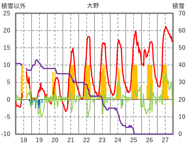 | 日 | 時 | 気温 | 降水 | 風向/風速 | 日照 | 積雪 | 降雪 |