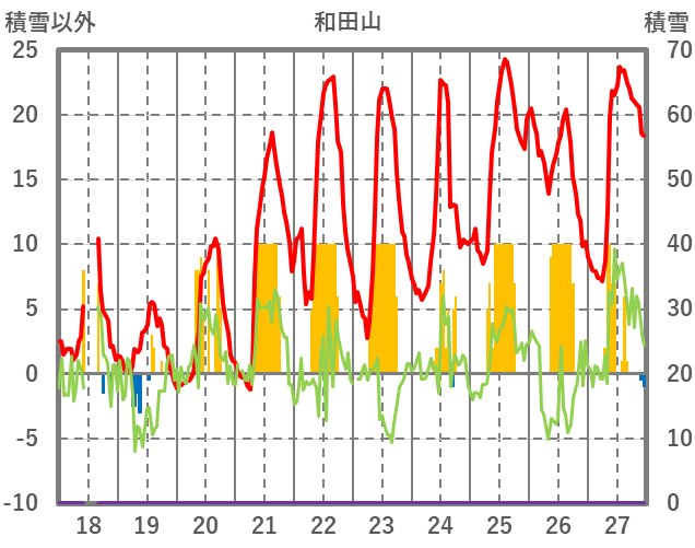 | 日 | 時 | 気温 | 降水 | 風向/風速 | 日照 | 積雪 | 降雪 |