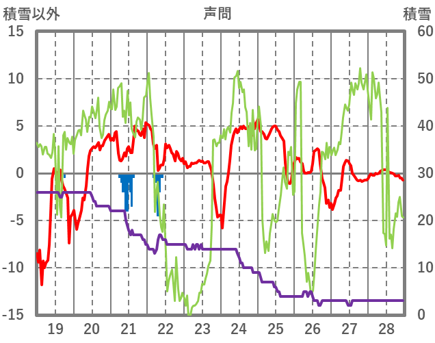 | 日 | 時 | 気温 | 降水 | 風向/風速 | 日照 | 積雪 | 降雪 |