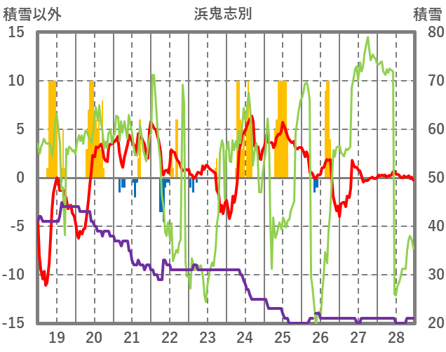 | 日 | 時 | 気温 | 降水 | 風向/風速 | 日照 | 積雪 | 降雪 |