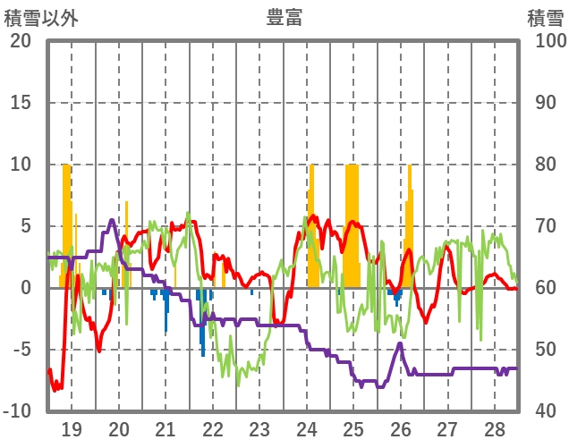 | 日 | 時 | 気温 | 降水 | 風向/風速 | 日照 | 積雪 | 降雪 |