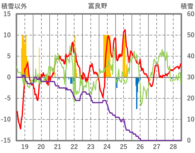 | 日 | 時 | 気温 | 降水 | 風向/風速 | 日照 | 積雪 | 降雪 |
