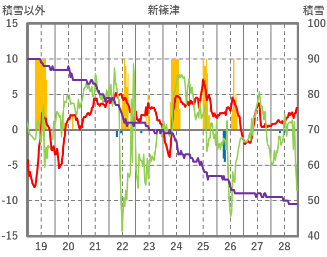 | 日 | 時 | 気温 | 降水 | 風向/風速 | 日照 | 積雪 | 降雪 |
