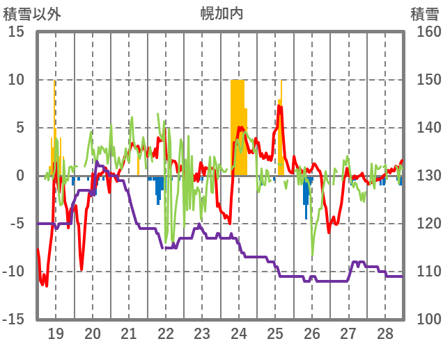 | 日 | 時 | 気温 | 降水 | 風向/風速 | 日照 | 積雪 | 降雪 |