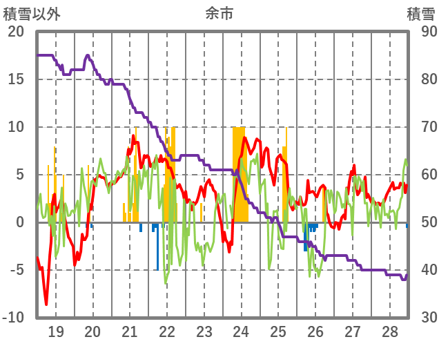 | 日 | 時 | 気温 | 降水 | 風向/風速 | 日照 | 積雪 | 降雪 |