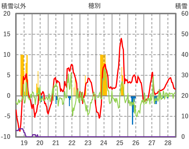 | 日 | 時 | 気温 | 降水 | 風向/風速 | 日照 | 積雪 | 降雪 |