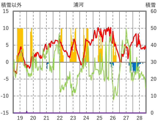 | 日 | 時 | 気温 | 降水 | 風向/風速 | 日照 | 積雪 | 降雪 |