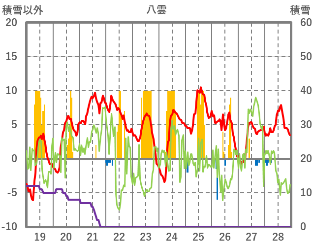 | 日 | 時 | 気温 | 降水 | 風向/風速 | 日照 | 積雪 | 降雪 |
