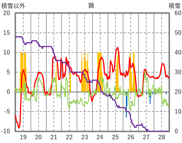 | 日 | 時 | 気温 | 降水 | 風向/風速 | 日照 | 積雪 | 降雪 |