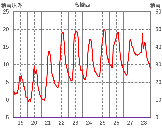 | 日 | 時 | 気温 | 降水 | 風向/風速 | 日照 | 積雪 | 降雪 |